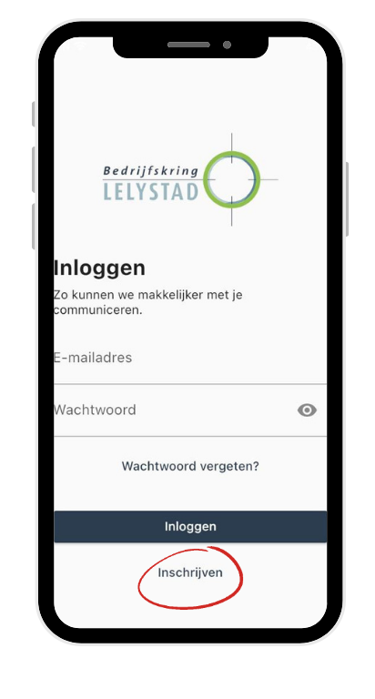 Stap 2: Kies voor Inschrijven onderaan de login pagina (let op: geef de app toestemming voor het gebruiken van je camera).
