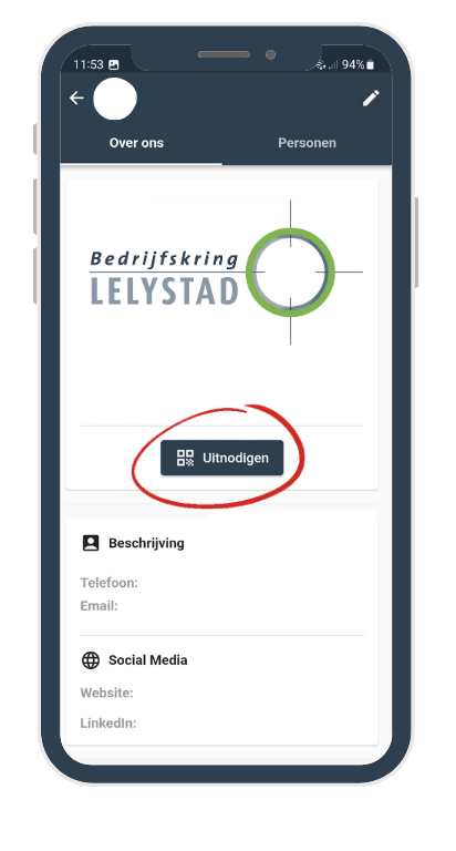 Stap 3: Open de BKL app op de telefoon van het hoofdaccount en ga naar Home> Klik op je naam bovenin > Mijn bedrijf > Uitnodigen. Hier vind je de unieke QR-code van jullie bedrijf.
